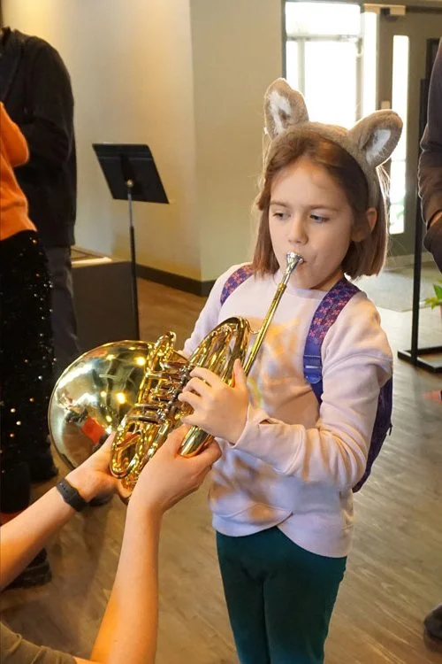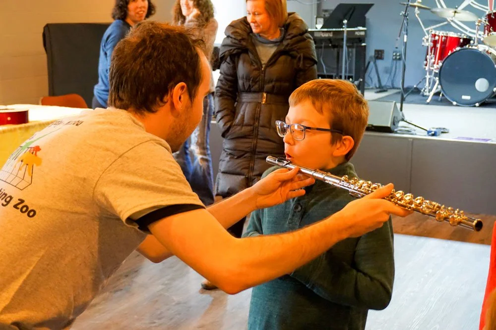 Young students experimenting on instruments at the Higday Instrument Petting Zoo